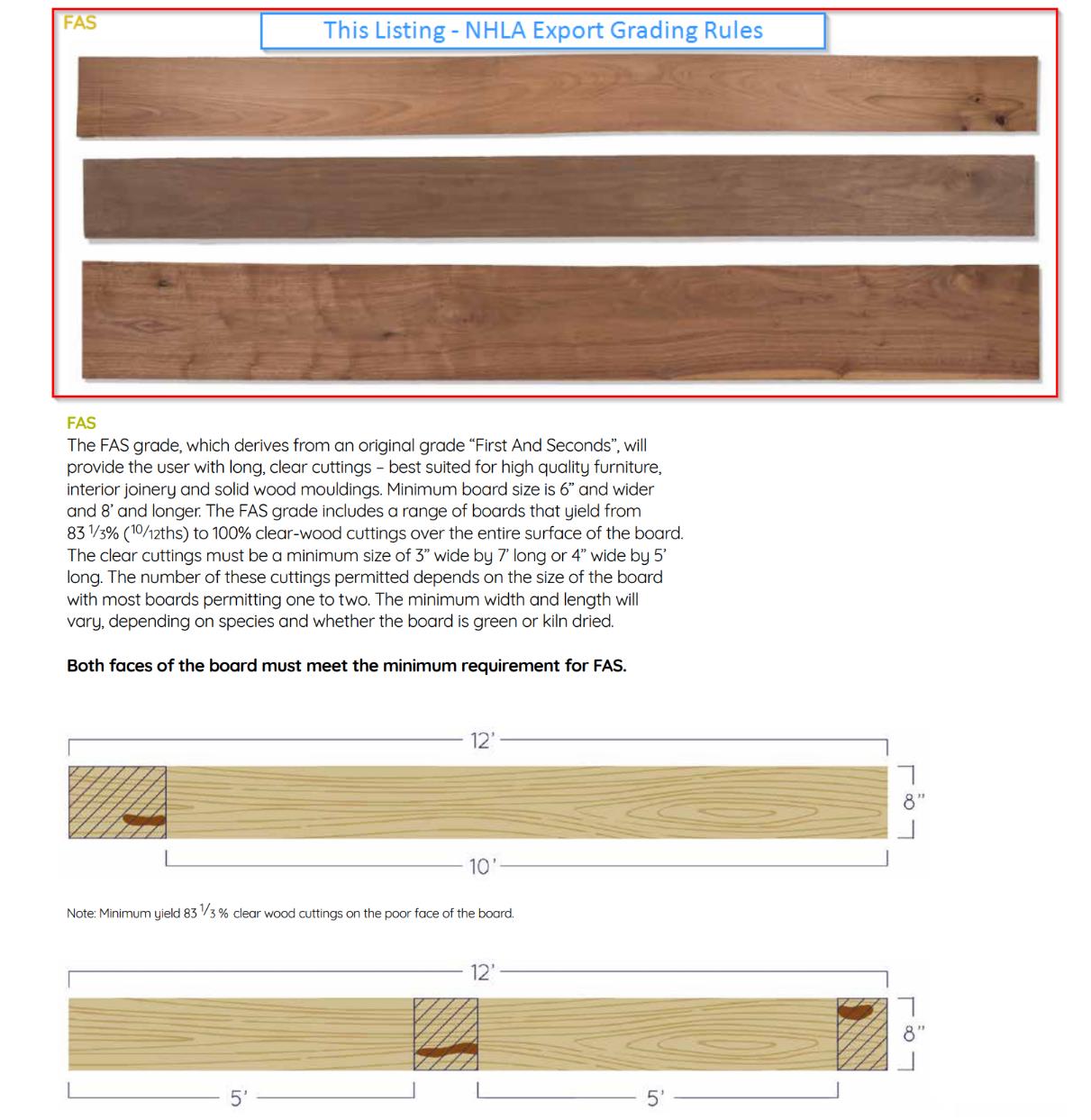 The highest grade for all lumber according to NHLA standards is First and Seconds (FAS). In order to reach this grade level, Black Walnut must have a minimum board size of 125mm (5 inches) x 1830mm (six feet) and have a minimum clear cutting size of 100mm (four inches) x (900mm) three feet. It must also be at least 83.3% defect free on both of its faces.
