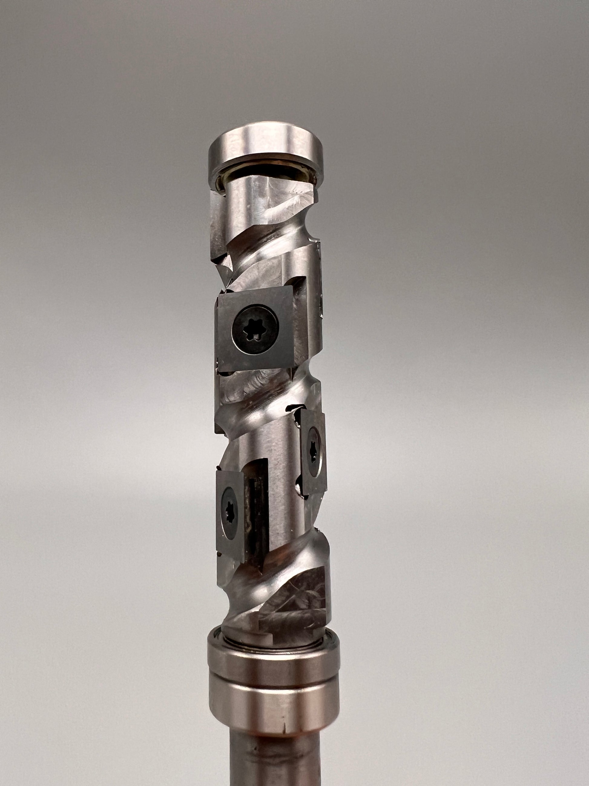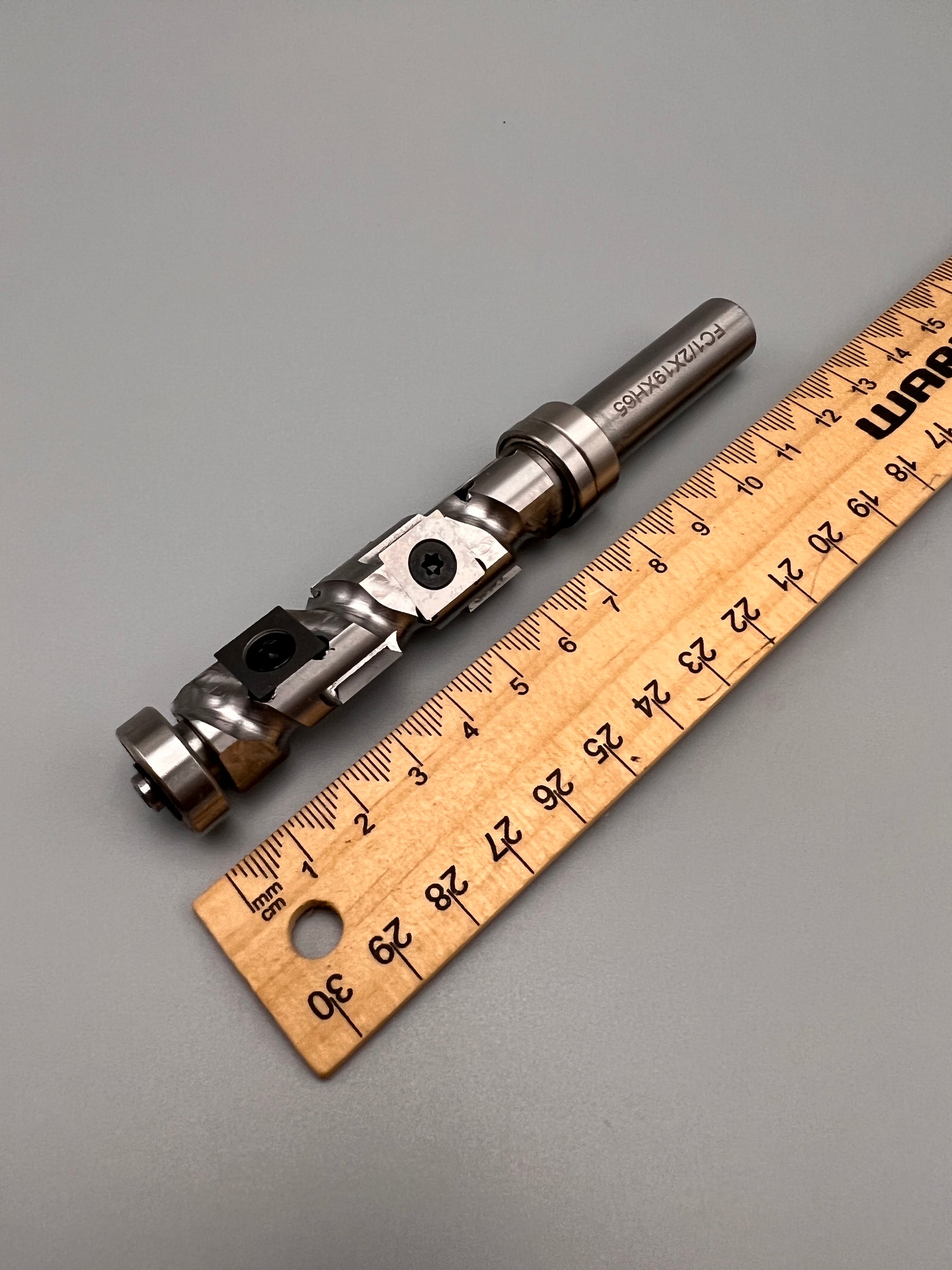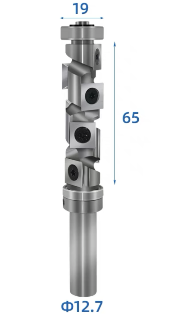 Heavy duty spiral cutter head carbide insert flush trim router bit. The problem with standard flush trim router bits is at large depths the entire blade will be in contact with the cutting surface - this consumes a significant amount of power for large depths which wears the blades out as well as your machine and can burn the cutting surface. Standard bits end up being disposed after use.